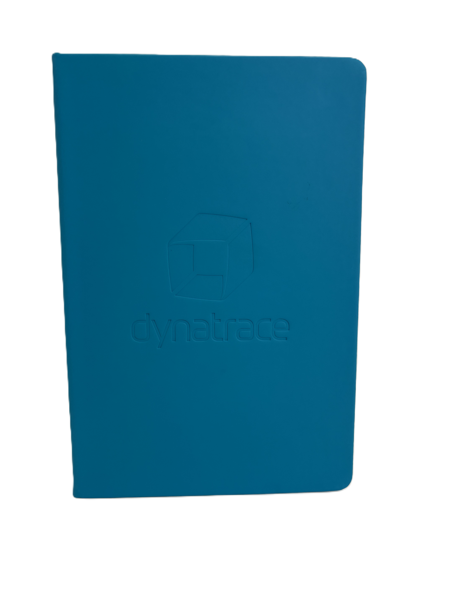 A5 soft finish notebook in cyan. 80 lined pages with ribbon book mark, pocket at the back, elastic pen loop and closure.